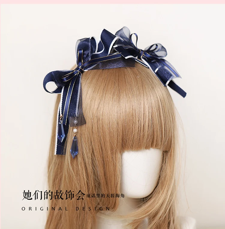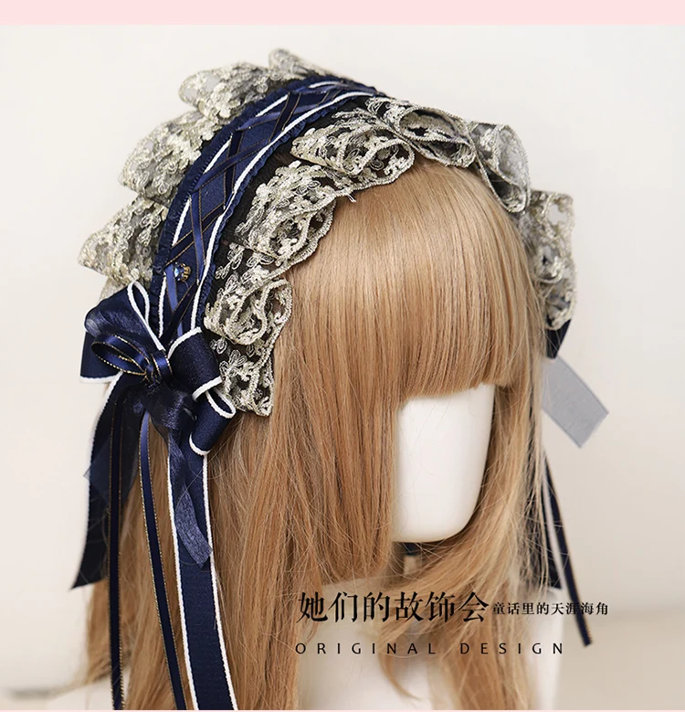 Vintage Navy Gold Stamping Lolita Girl Lace Bowknot Side Clip Hair band KC Head Band Cosplay Hairpi