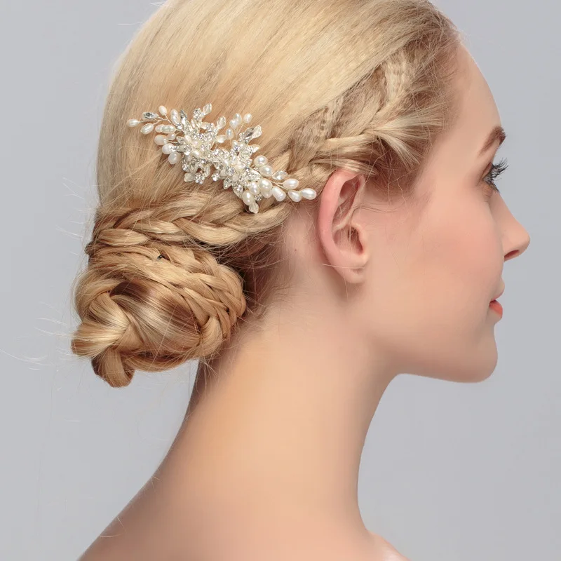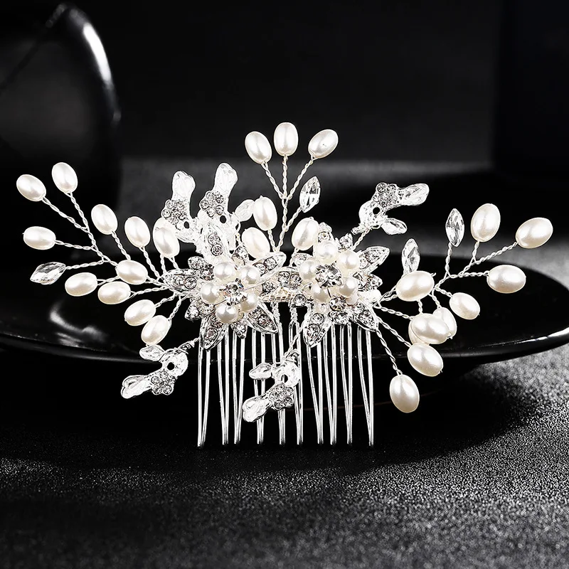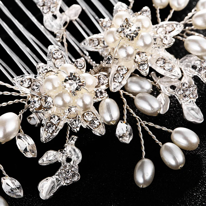 Hot Sale SLBRIDAL Handmade Silver Color Rhinestone Crystal Pearls Flower Leaf Wedding Hair Comb Bridal Headd